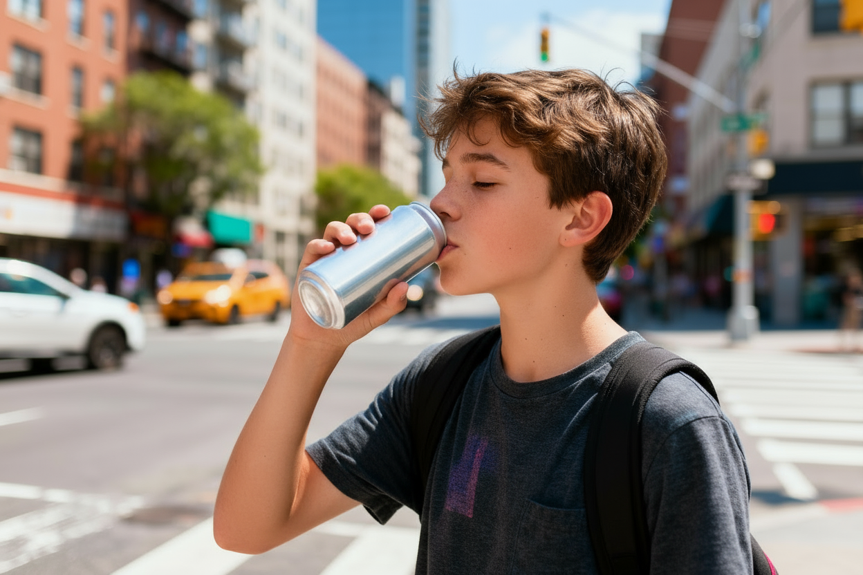 ¿Aceptarías que un niño de 12 años entrase a un bar y se bebiera dos cafés seguidos? Desconcertante… ¿verdad? pero eso mismo es lo que muchos adolescentes consumen en una sola lata de bebida energética. La diferencia es que el café no viene envuelto en colores llamativos ni respaldado por un marketing que convierte un estimulante en un «refresco moderno».